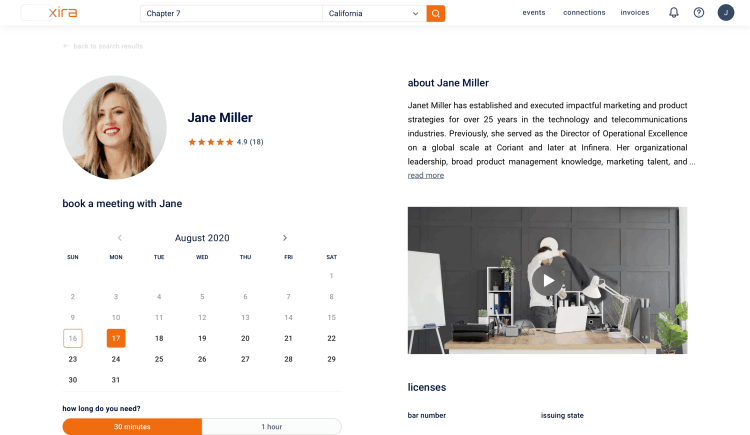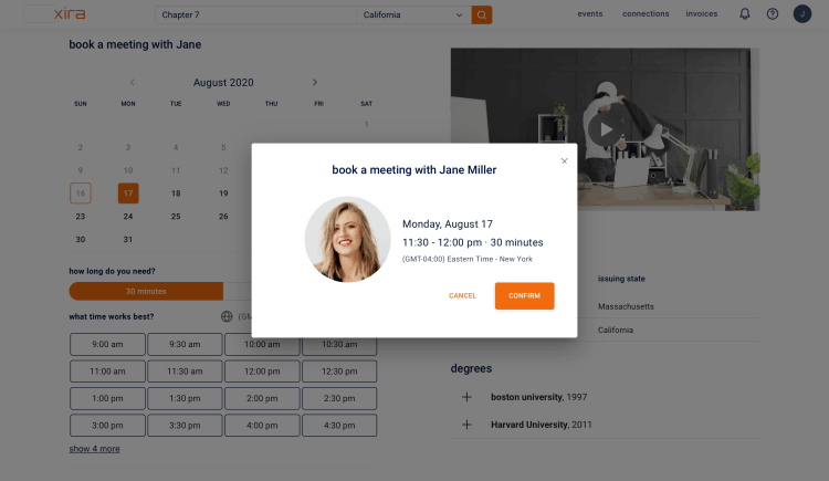 ongoing meetings with an existing client are affordable, simple and convenient. you can simply conduct all your recurring meetings on xira where it's most convenient for both the lawyer and the client. when a meeting is needed, send an automated meeting request to your client and let them pick a time directly on your calendar